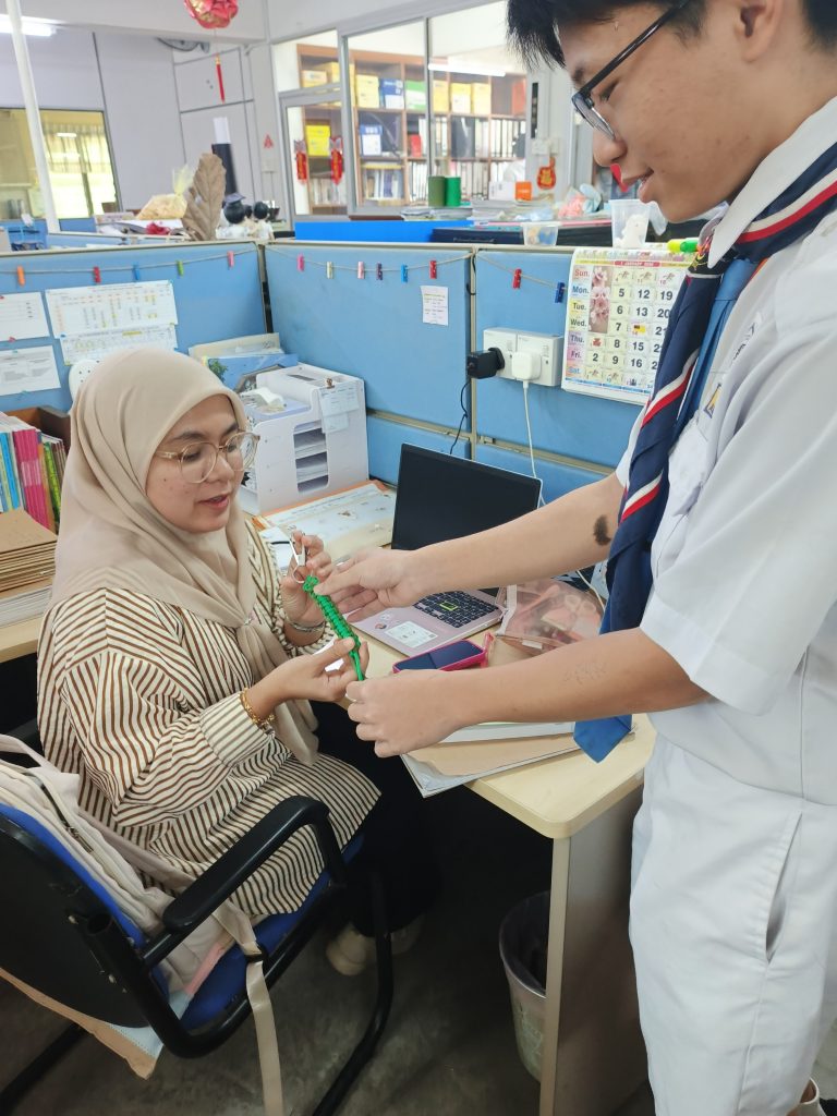 童军洪诚良教练到校指导童军团制作钥匙圈,教学内容包括双钱结、钻石结以及伞绳手链编织法的结合应用。学生们在学习过程中表现投入,不仅掌握了基本技巧,也发挥创意,亲手编织绳结作品,作为开斋节礼物送给老师和学校职员,展现了关怀与感恩之心。