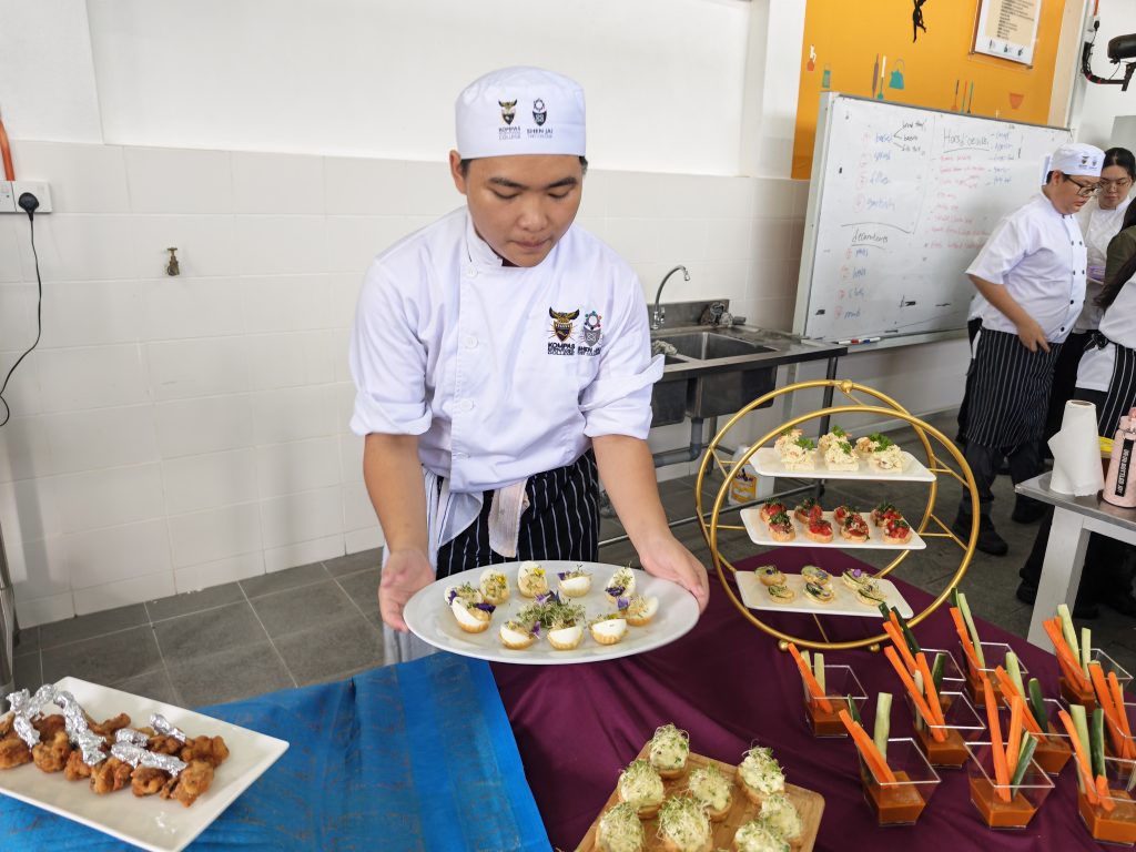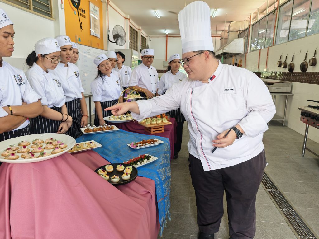 Hors d’oeuvre 常见于宴会、派对或西式餐点的前菜,以小巧精致、便于入口为特色。同学们以番茄布鲁斯凯塔、烟熏三文鱼奶油起司、魔鬼蛋、鸡肉沙拉串、番茄起司黑橄榄串,以及新鲜酥炸蔬菜佐番茄酱等多样料理进行练习,在一口之间展现风味与口感的层次变化。