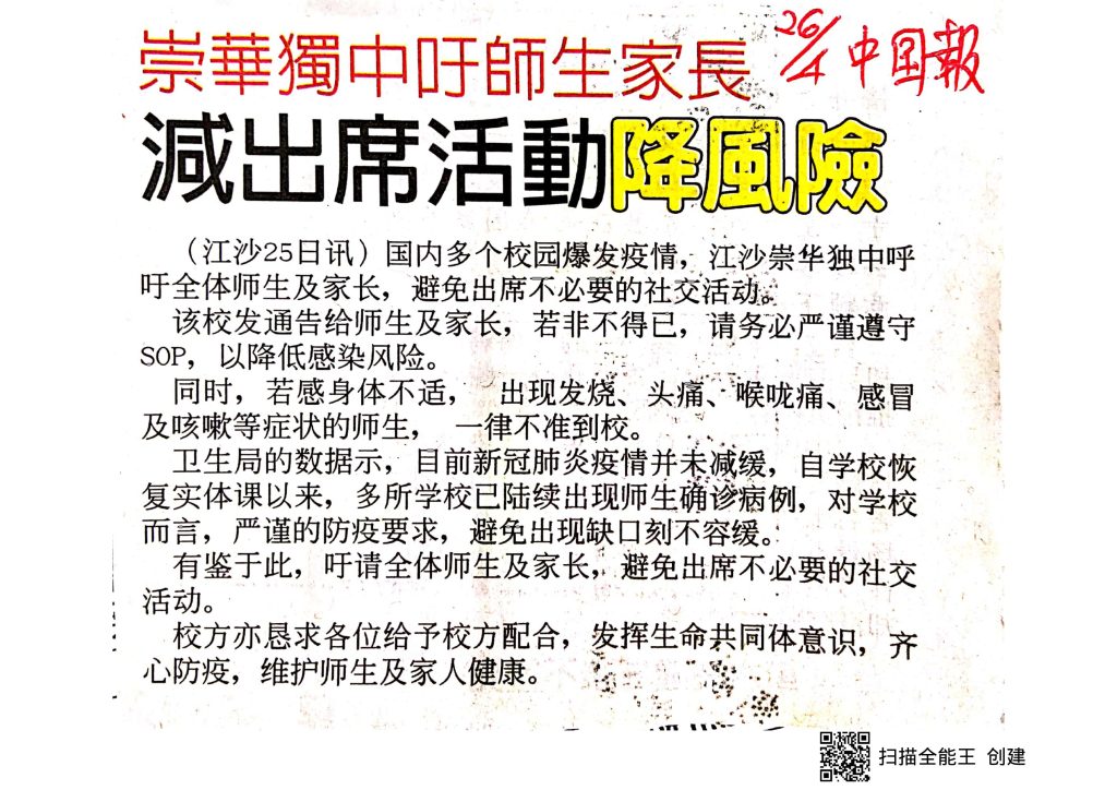 11 May 2021 | 【校园剪报】崇华独中今年起为教职员买医药保单