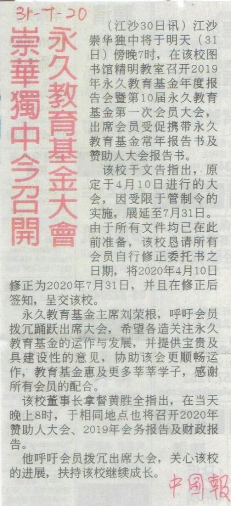 25 Jun 2020 | 【校园剪报】崇华独中2人生病缺课