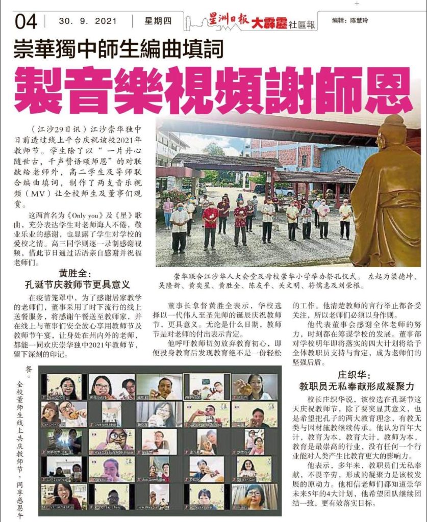 “ 一片丹心随世古,千声赞语颂师恩 ”,崇华独中学生以此对联献上对师恩的感谢,透过线上平台庆祝了该校2021年教师节。点击此处阅读更多