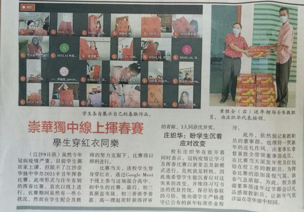 19 Feb 2021 | 【校园剪报】2020统考成绩出炉了!高中考生整体表现不错,跟往年相比,总及格率高达87.47%。 初中考试总及格率为78.75%