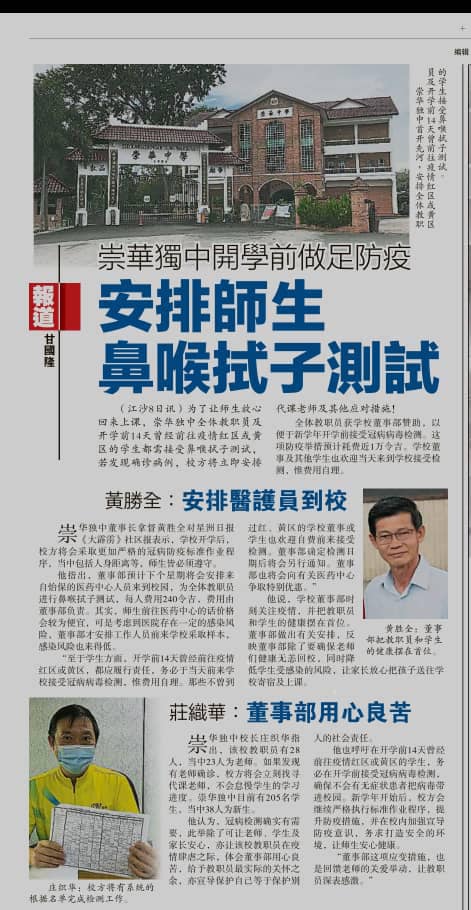 崇华独中全体教职员获本校董事部赞助,于2021新学年开学前接受新冠病毒检测,料为全国首开先河。这项防疫举措预计耗费近万令吉。若发现确诊病例,校方将立即安排代课老师弥补空缺。详细内容请按此