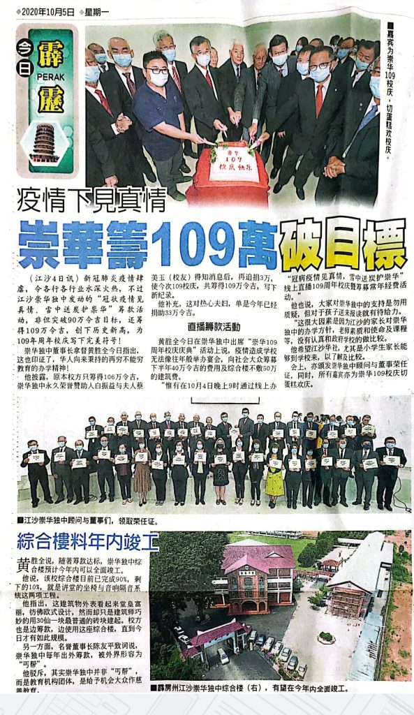 2 Oct 2020 | 【校园剪报】崇华独中下半年筹款逆流而上.筹得近90万令吉