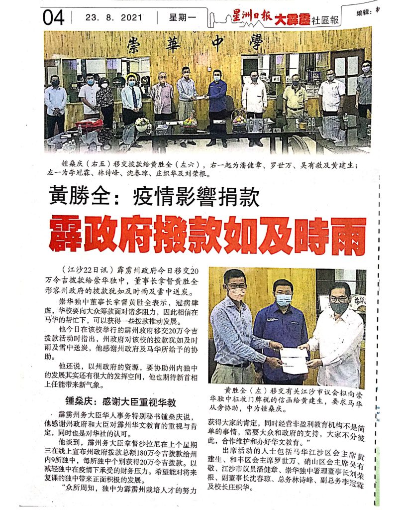 8 Aug 2021 | 【校园剪报】校方借电脑给学生 崇华独中网课出席率98%