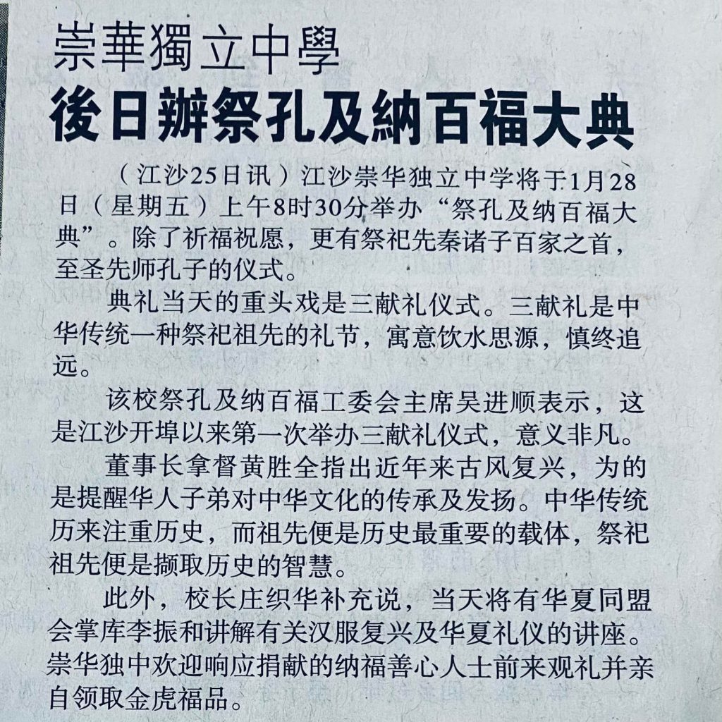 29 Jan 2022 | 【校园剪报】崇华纳福活动成绩斐然突破目标筹获42万