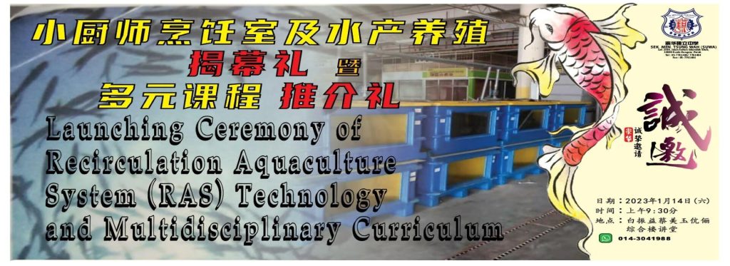 2023新学年,崇华独中与Hellas Tecnology Sdn Bhd 合作,成为全马第一所开办水产养殖课程的中学。此课程有别于传统的养殖业,这是采用新科技进行养鱼。活动当天,也会进行小厨师烹饪室揭幕礼及多元课程推介礼。