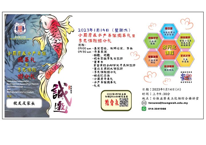 诚邀各界出席2023年 1月14日 (星期六)小厨师烹饪室及水产养殖揭幕礼暨多元课程推介礼。