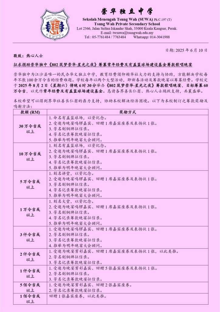 崇华独中将于八月二日举办【802 筑梦崇华·星光之夜】筹募常年经费及有盖篮球场建设基金 歌唱晚宴,恳请各位踊跃资助母语教育。